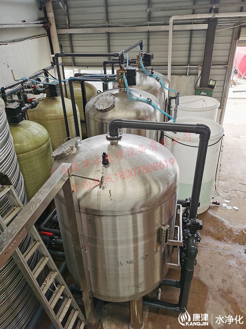 工(gong)藝流程:井水(shui)-原(yuan)水(shui)箱(xiang)-錳砂(sha)過濾器-石(shi)英砂(sha)過濾器-活性炭過濾器-軟化水(shui)-凈水(shui)箱(xiang)