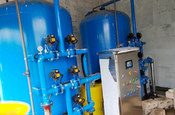 工藝流程:地下(xia)水(shui)-絮凝加藥-石英砂過(guo)濾(lv)(lv)器-二級過(guo)濾(lv)(lv)-二氧化氯加藥器-凈水(shui)箱-生活用水(shui)