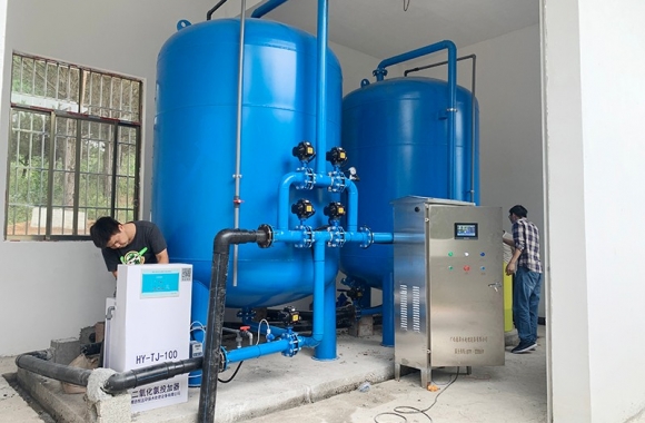 工藝流程:山泉水-絮凝投加器-石英砂過濾器-二氧化氯(lv)加藥(yao)器-用水點