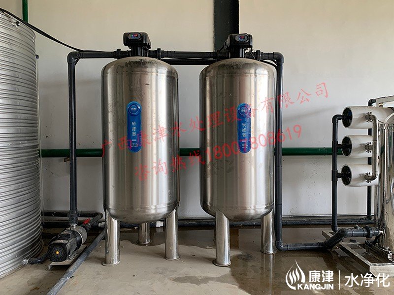 工藝流程:原水箱-原水泵-石英砂過濾(lv)器(qi)-活(huo)性炭過濾(lv)器(qi)-精密過濾(lv)器(qi)-反滲(shen)透(tou)設備-凈水箱-變(bian)頻供水-各點用水