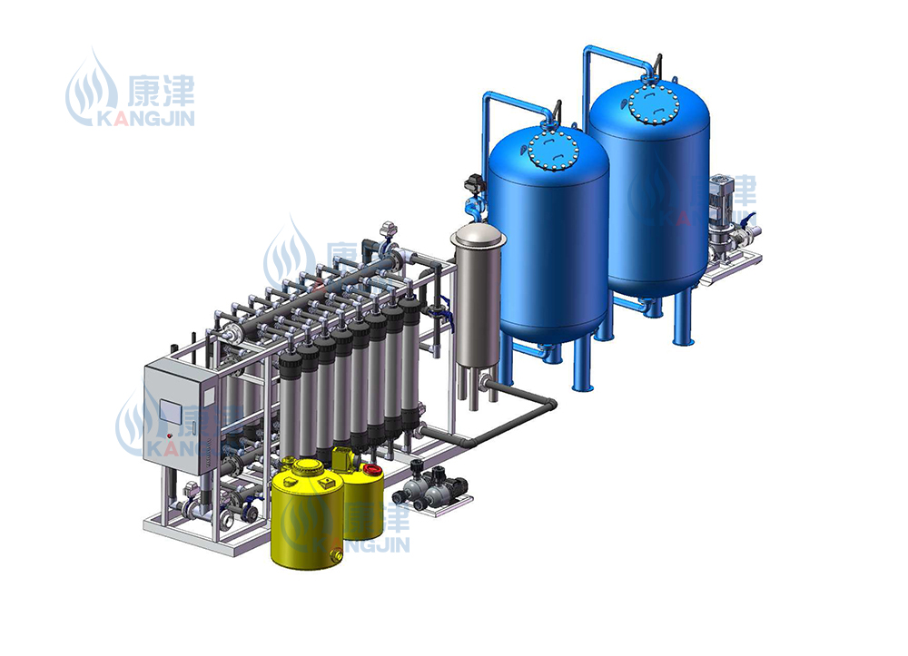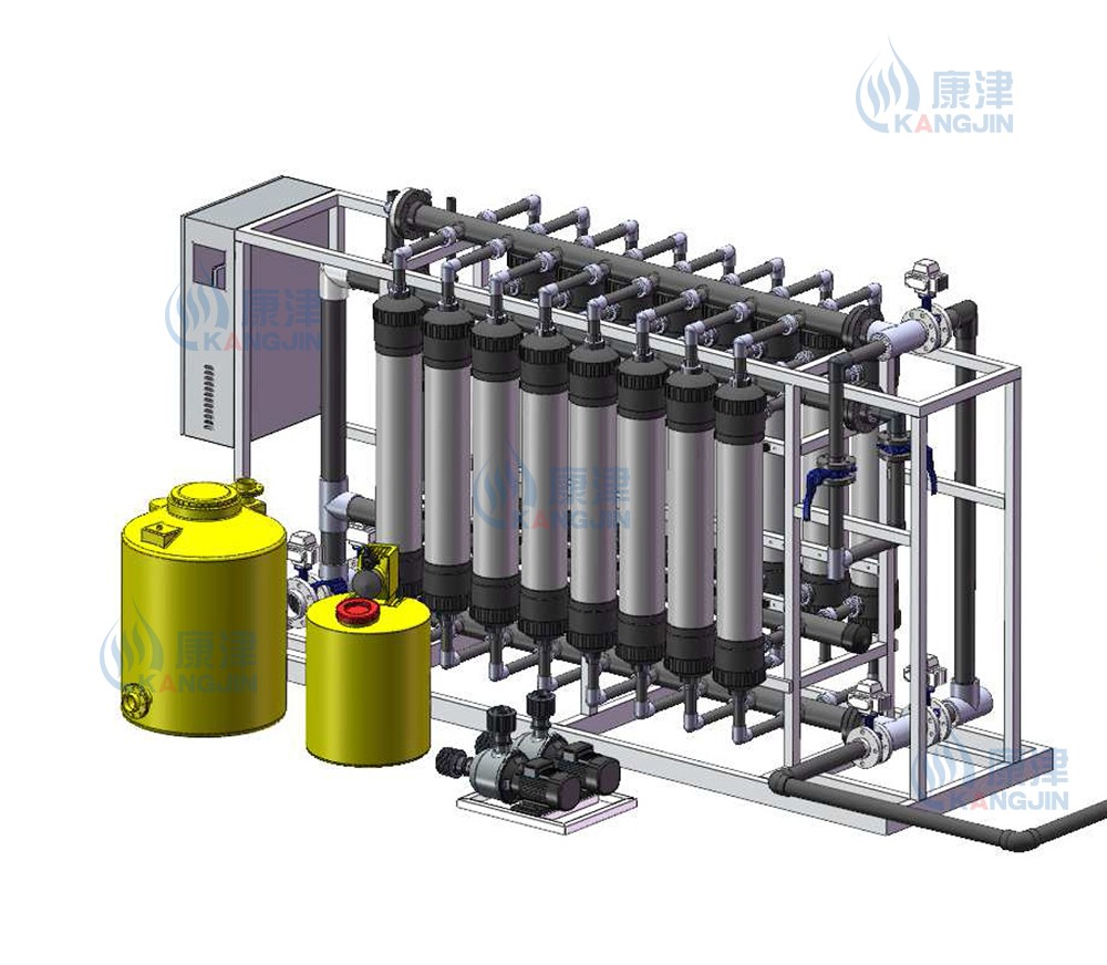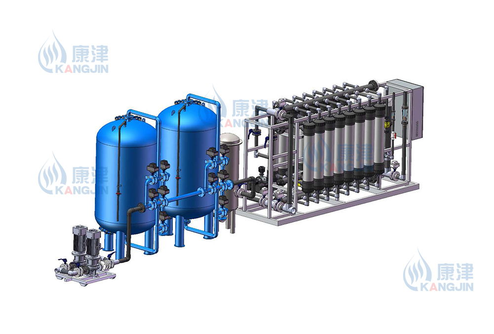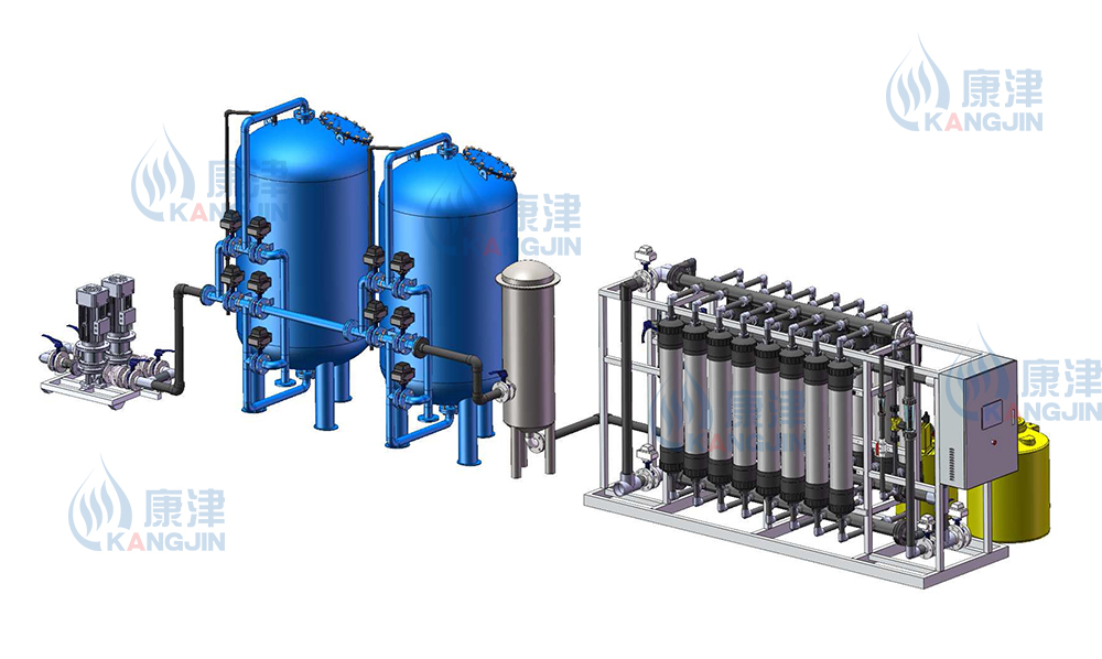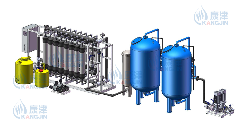 本方案主要針對原水為河水,以河水為飲用水源的地區,常常在雨季會遇到水質渾濁發黃問題。河水通常比較渾濁,水面漂浮臟東西、樹葉、水藻等,尤其在暴雨季節,水中泥沙量增加,雜質多,濁度、色度、氣味、細菌含量超標,因此必須使用專業凈水設備處理后才能達到生活飲用的目的。我們對河水的凈化主要是除去水中雜質,包括以下幾種:泥沙、大分子顆粒雜質、懸浮物、藻類、膠體,去除污染色度、異味、微生物、細菌、病毒等,有的源水會含有HCO、Ca 、SO 、Cl 、Na 、Mg 和K。為了將河水指標達到生活用水標準,通過康津超濾設備進而得到凈化。康津水處理為根據實際用途情況制定以下解決方案。用水人數大約在400至500人,用水處理量每小時約15-20噸。