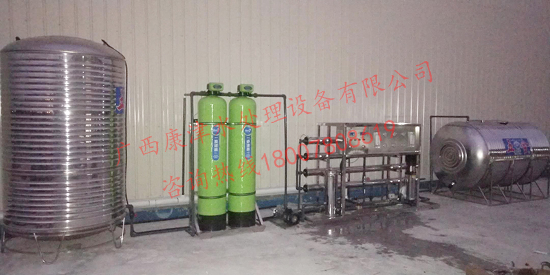 原(yuan)水(shui)→原(yuan)水(shui)箱→原(yuan)水(shui)泵→多介質(zhi)過濾器→活性炭過濾器→保(bao)安過濾器→高(gao)壓泵→反滲透(tou)裝置→產水(shui)箱→用(yong)水(shui)點