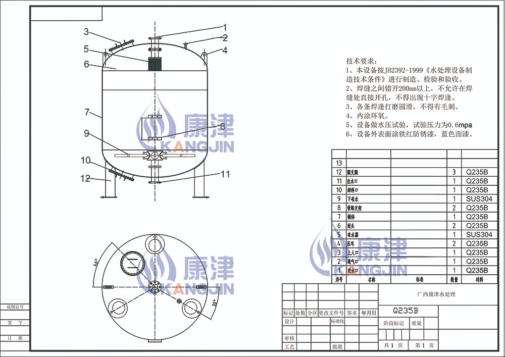 設備主(zhu)要由(you)罐(guan)體、布(bu)水(shui)系統、集(ji)水(shui)系統、濾料層(ceng)、承托層(ceng)及內部配套管路(lu)等(deng)組(zu)成,外部聯接原水(shui)進水(shui)、清(qing)水(shui)出水(shui)、反沖(chong)洗排水(shui)等(deng)主(zhu)要管道和閥門與其相配的控制系統、壓(ya)力表、取樣閥等(deng)。